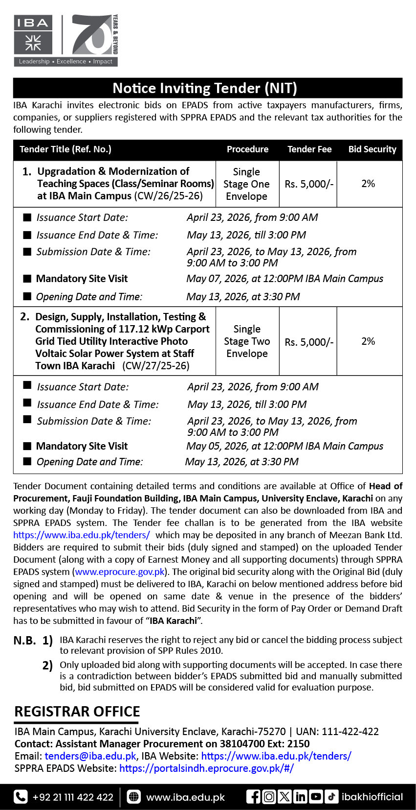 Design, Supply, Installation, Testing & Commissioning of 117.12 kWp Carport Grid Tied Utility Interactive Photo Voltaic Solar Power System at Staff Town IBA Karachi (Jang Ad | Tribune Ad | Awami Awaz | Technical Document (Total Download:0) | Financial Document | Notification PC | CRC | APP) |