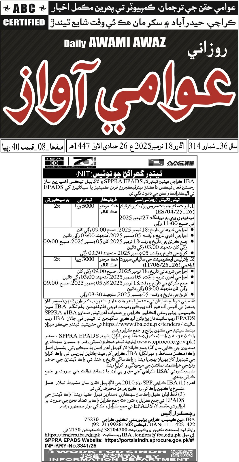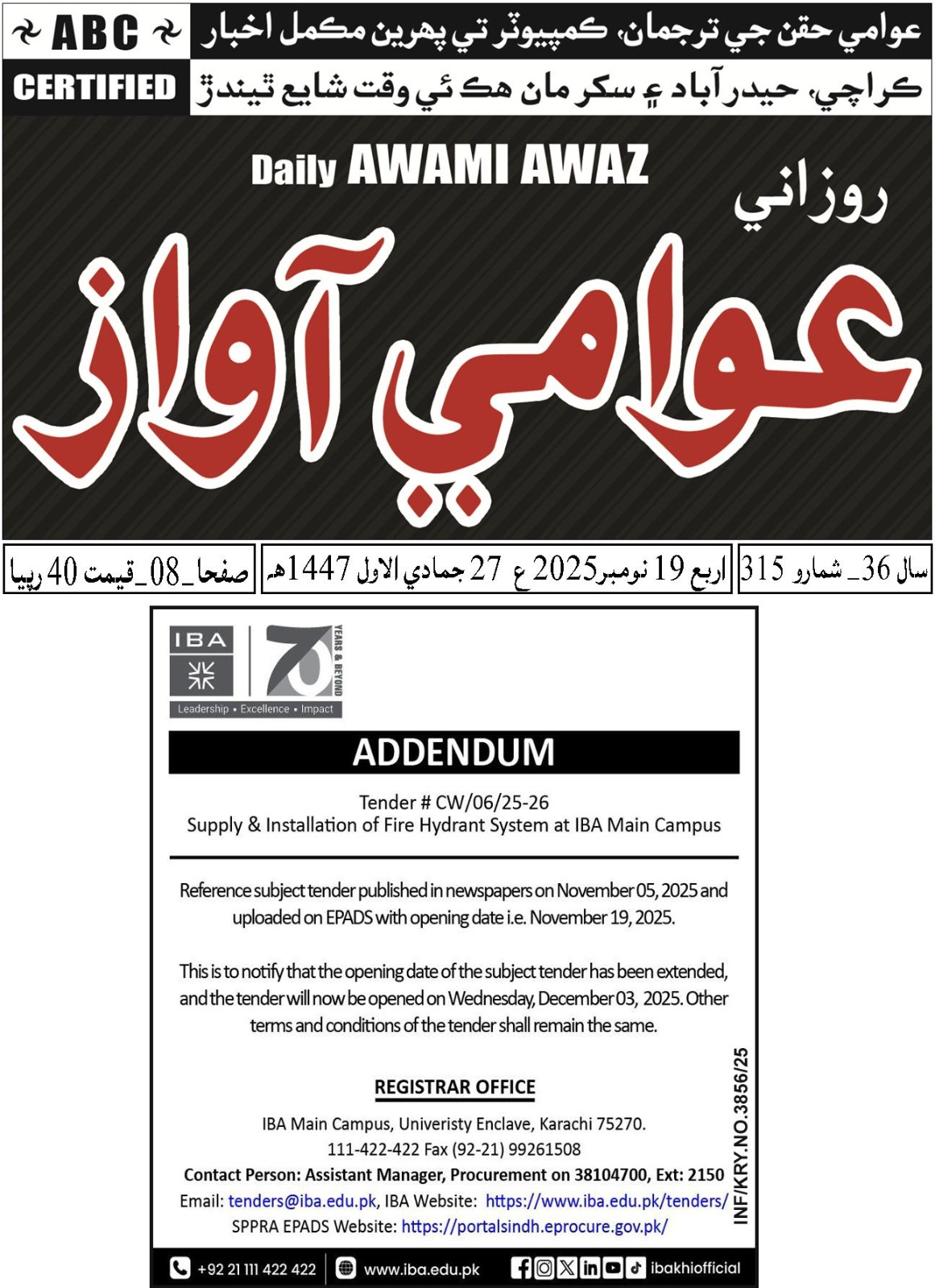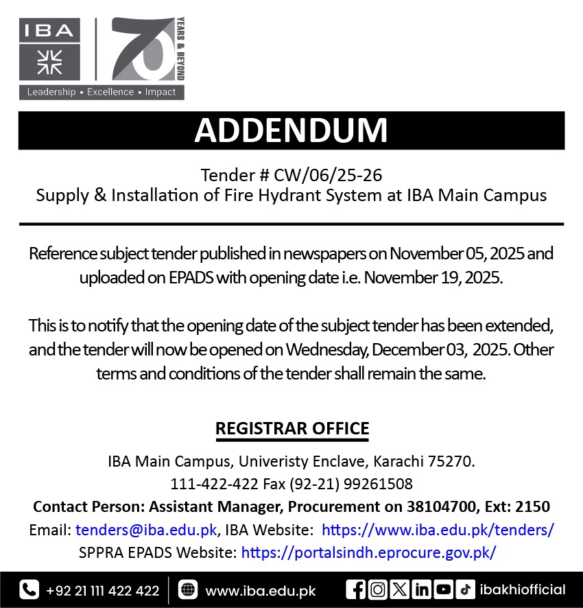Supply & Installation of Fire Hydrant System at IBA Main Campus (Express Tribune | Awami Awaz | Notification PC | CRC | Bidding Document (Total Download:5) | APP | Jang | Addendum | Jang Addendum | Awami Awaz Addendum | Tribune Addendum) |