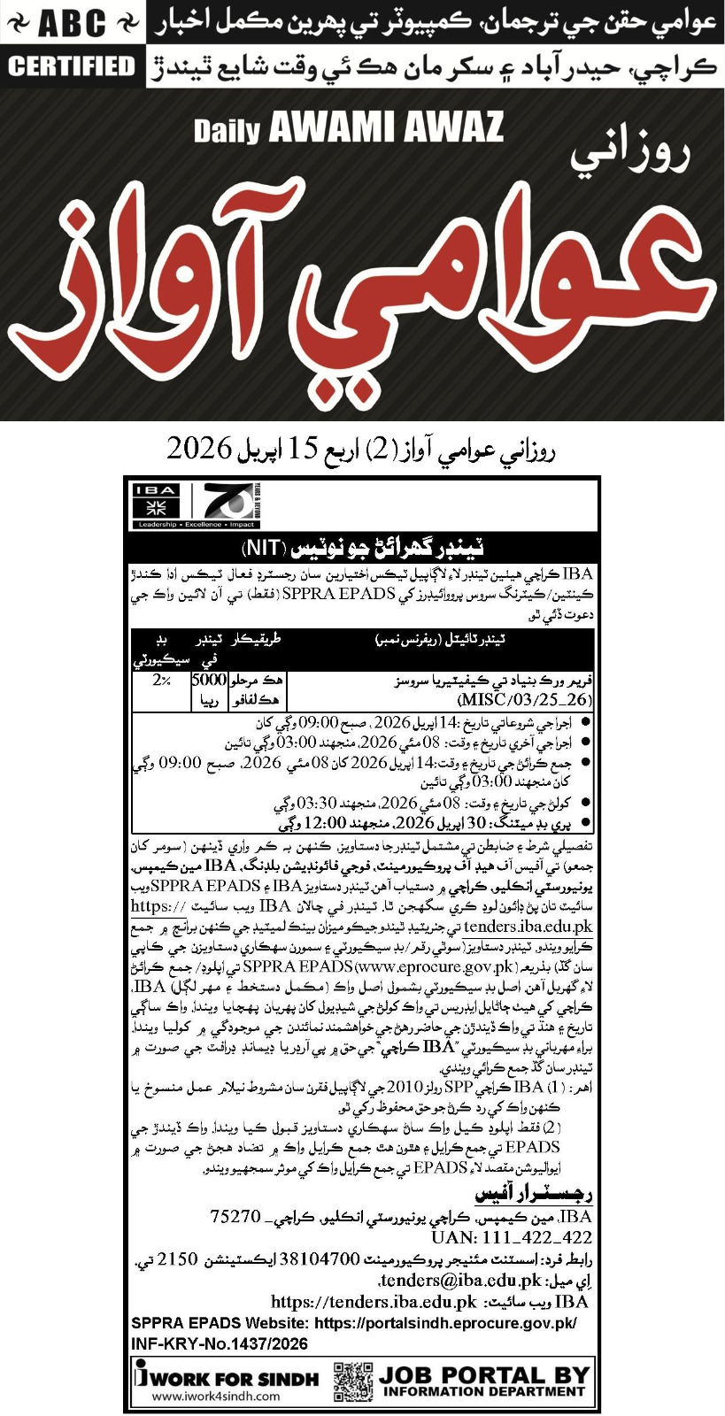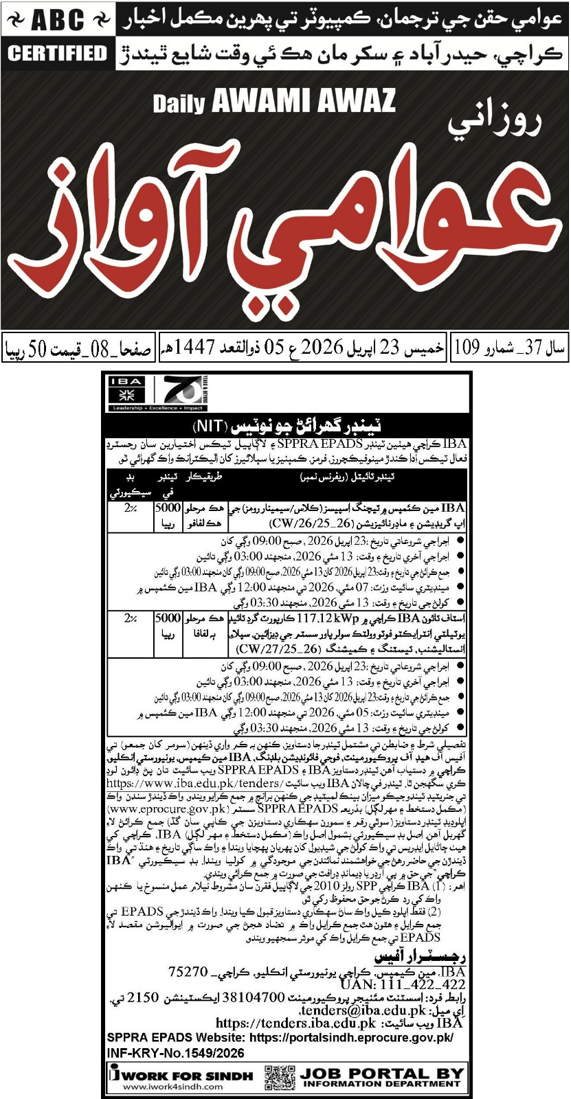 Upgradation & Modernization of Teaching Spaces (Class/Seminar Rooms) at IBA Main Campus (Jang | Tribune | Awami Awaz | Bidding Document (Total Download:0) | Drawing-1 | Drawing-2 | Drawing - 3 | Notification PC | CRC | APP) |