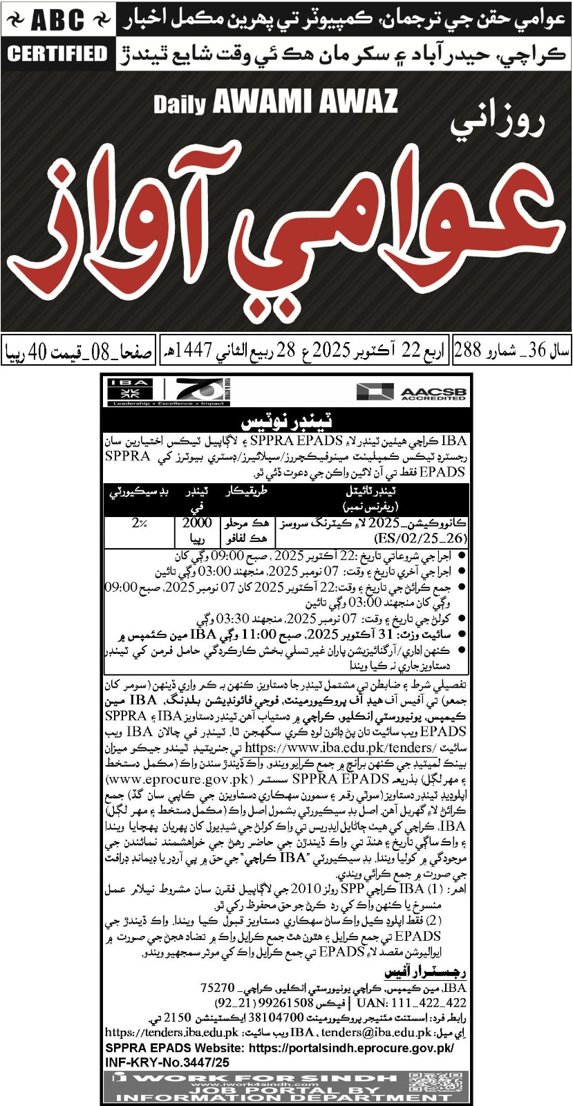 | 12332 | ES/02/25-26 | Catering Services for Convocation-2025 (English Ad | Sindhi Ad | Notification PC-B | CRC | Bidding Document (Total Download:2) | APP) | 22-10-2025 | 07-11-2025 | 07-11-2025 03:30 PM | Rs. 2000/= (Fee Voucher)